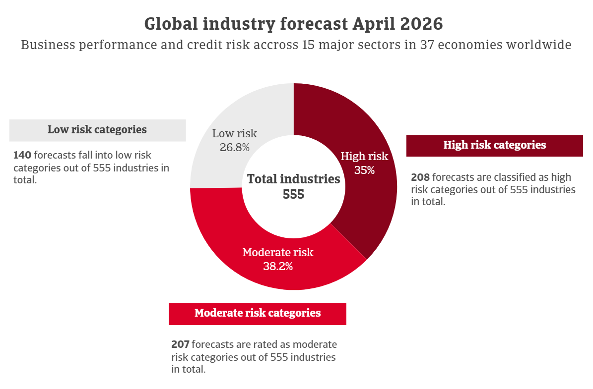 In total, 555 forecasts have been issued. Of these, 140 fall into low-risk categories, 207 are rated as moderate risk, and 208 fall into the high-risk category. This represents an increase of 14 sectors in the high-risk group since January 2026. The chemicals sector is the most affected by recent downgrades, with conditions worsening most sharply in Europe. This outcome is unsurprising, given the sector’s strong exposure to sharp oil and gas price volatility driven by the war in the Gulf.