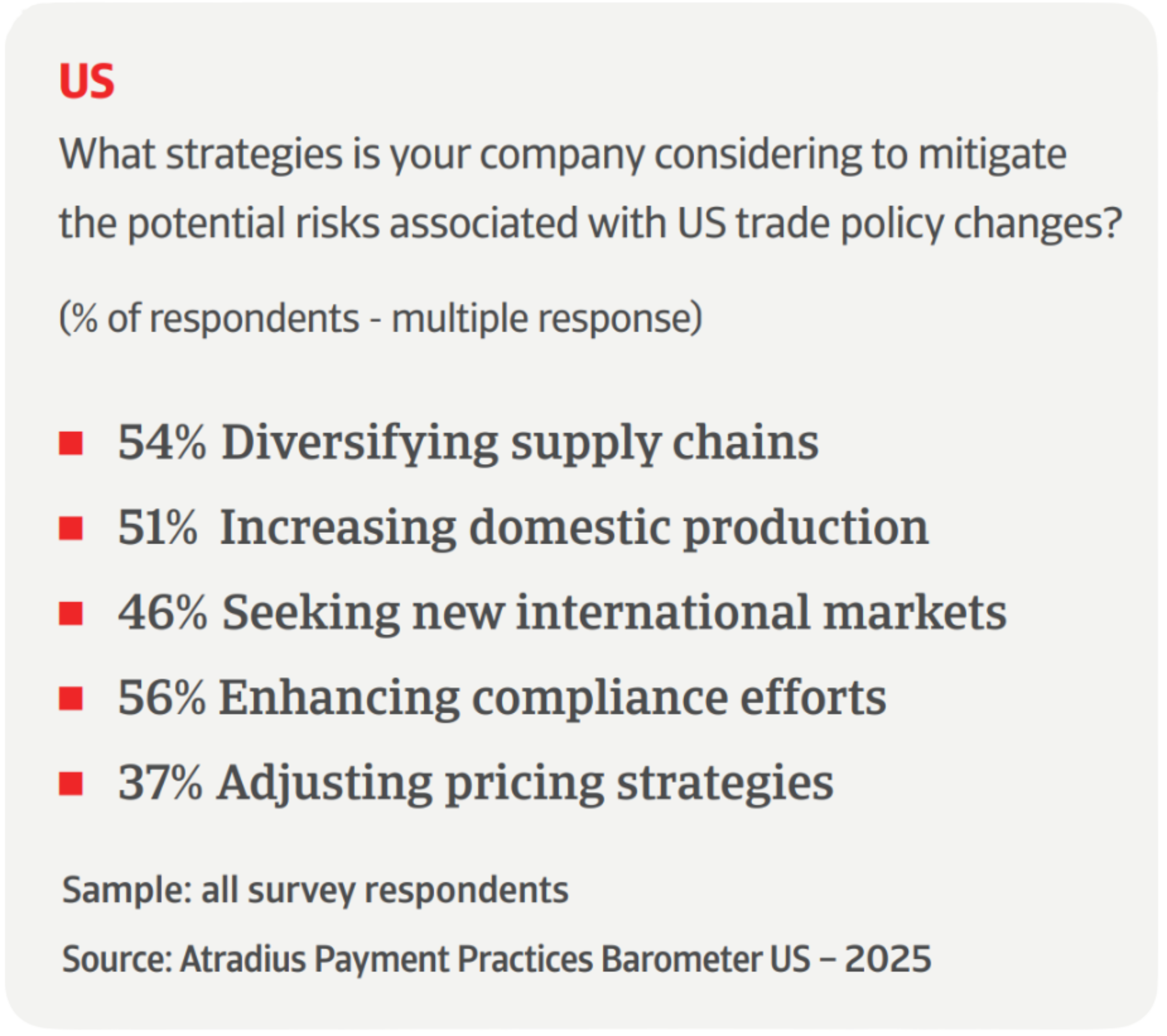 Faced with these pressures, companies are taking strategic action. A majority (56%) plan to enhance regulatory compliance, while 54% are diversifying supply chains, highlighting a strong focus on reducing risk and improving resilience. Over half (51%) are increasing domestic production, and 46% are seeking new international markets to maintain global competitiveness. Adjusting pricing strategies (37%) also suggests rising awareness of margin pressures in today’s unpredictable trade landscape. Notably, the most common approaches centre around supply chain diversification and boosting domestic production, pointing to a clear shift towards operational self-reliance.