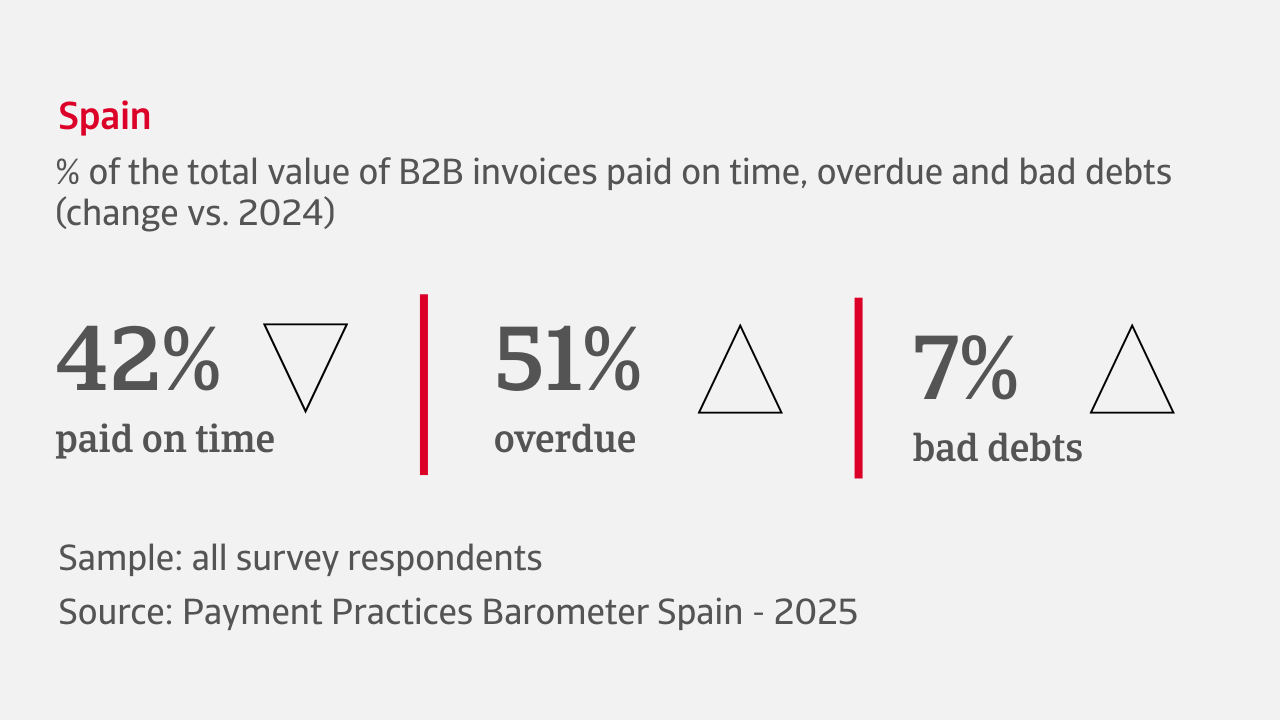 Widespread concern about business-to-business (B2B) payment practices is evident in our survey, with 63% of Spanish companies telling us they see no improvement in B2B customer payment patterns compared to last year. Overdue invoices currently affect an average of 51% of all B2B sales on credit, with late payments mainly due to cash flow issues during the current uncertain economic and trade landscape. Bad debts affect an average of 7% of B2B invoices, causing particular concern in the steel/metals sector.