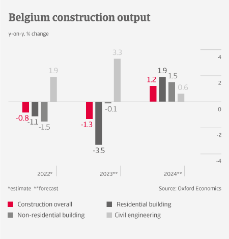 In 2023, we expect Belgian construction output to contract 1.3% after a 0.8% decrease in 2022, mainly due to lower activity in the residential and industrial construction segments. Both suffer from high inflation and increased financing costs for building activities. Only civil engineering output is expected to grow this year (by about 3%), supported by public investment in clean energy and infrastructure projects. The renovation work segment focused on energetic renovation (heating, ventilation, isolation and renewable energy) remains resilient, because it benefits from government support (VAT decrease).
