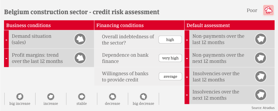 Many businesses are highly indebted, and a combination of high prices for energy, building materials and increased wage expenses is putting high pressure on margins. Belgian construction companies operate in a very competitive environment, in particular in the public tendering business. Passing on higher input costs is very difficult, because prices have usually been fixed for a longer period of time.