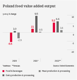 Food & beverages is one of Poland’s strongest industries, and value added output is forecast to grow by more than 5% in 2022. However, increased energy costs affect the margins of some segments (cold stores, food distributors, ready-to-eat meal producers), while meat producers and processors have to deal with higher prices for animal feed. Passing on higher input costs is difficult, as price competition in the retail segment is fierce. In this segment a concentration process is ongoing, and many smaller food retailers had to leave the market over the past couple of years.