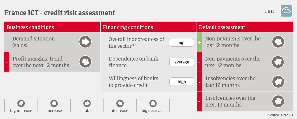 According to the French Ministry of the Economy, payments in the ICT sector take 68 days on average, compared to 49 days for all industries. Public institutions and large telecommunication businesses, for example, demand extended payment terms for administrative reasons. In 2021, ICT insolvencies started to increase modestly from the historically low level seen in 2020. In Q1 of 2022 business failures were back to “normal” levels recorded in Q1 of 2019, and we expect further increases in the coming twelve months. Mainly affected will be ICT service providers and ICT wholesale/retail. Smaller businesses in those segments face higher gearing because fiscal measures have expired, while working capital requirements have increased with the ongoing supply chain issues. At the same time margins are shrinking as demand slows down, semiconductor shortages hamper product offering, and higher inputs cost are difficult to pass on to end-customers.
