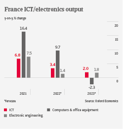 The French ICT market recorded robust growth in 2021, driven by the surge in remote working and digitalisation needs. However, demand is slowing down after peaking during the pandemic. The market for computers and smartphones is more mature, and we expect a 4% decrease in value this year. Ongoing supply chain issues (transportation bottlenecks, semiconductor shortages) have a strong impact on French ICT businesses, leading to sharp input price increases and less product offerings. Recent lockdowns in China have exacerbated this effect.