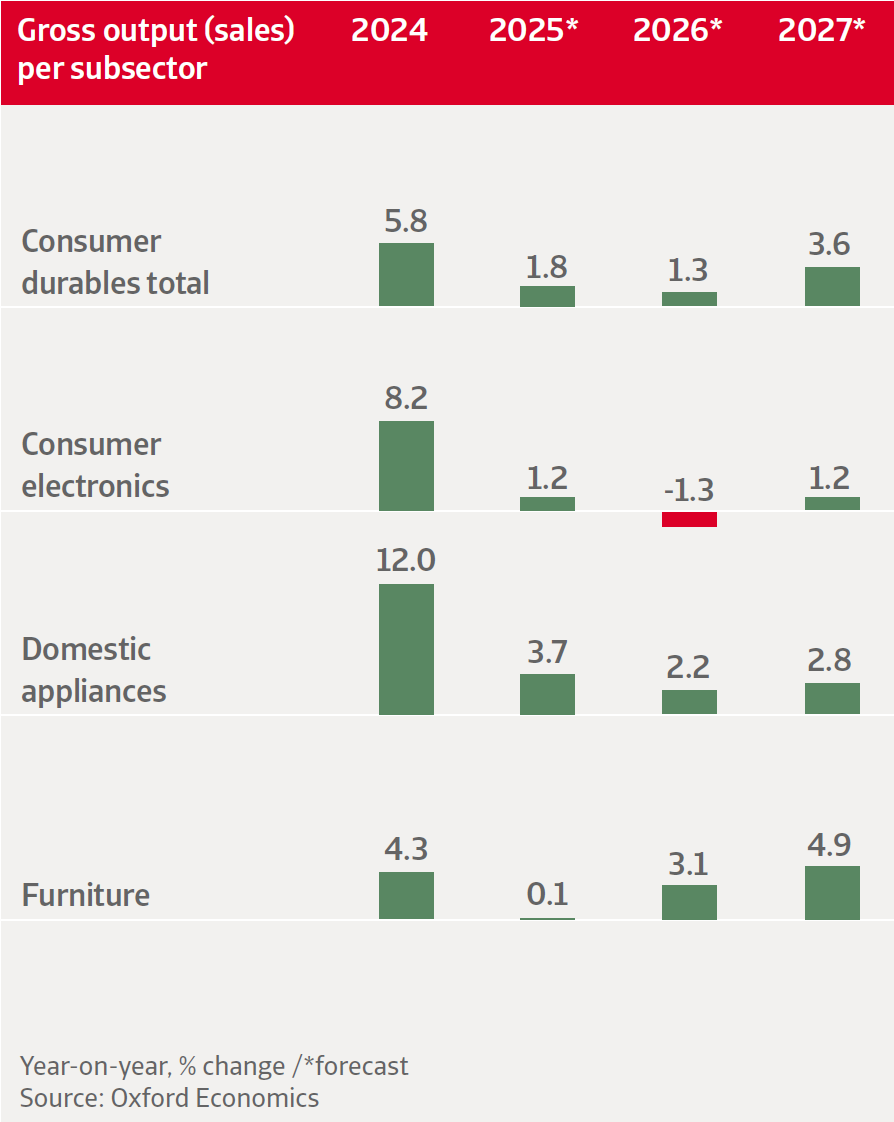 After a 1.2% growth in 2025 we expect consumer durables sales in the UK to contract by 1.1% in 2026. UK Consumer confidence remains volatile amid lower pay growth and higher inflation.