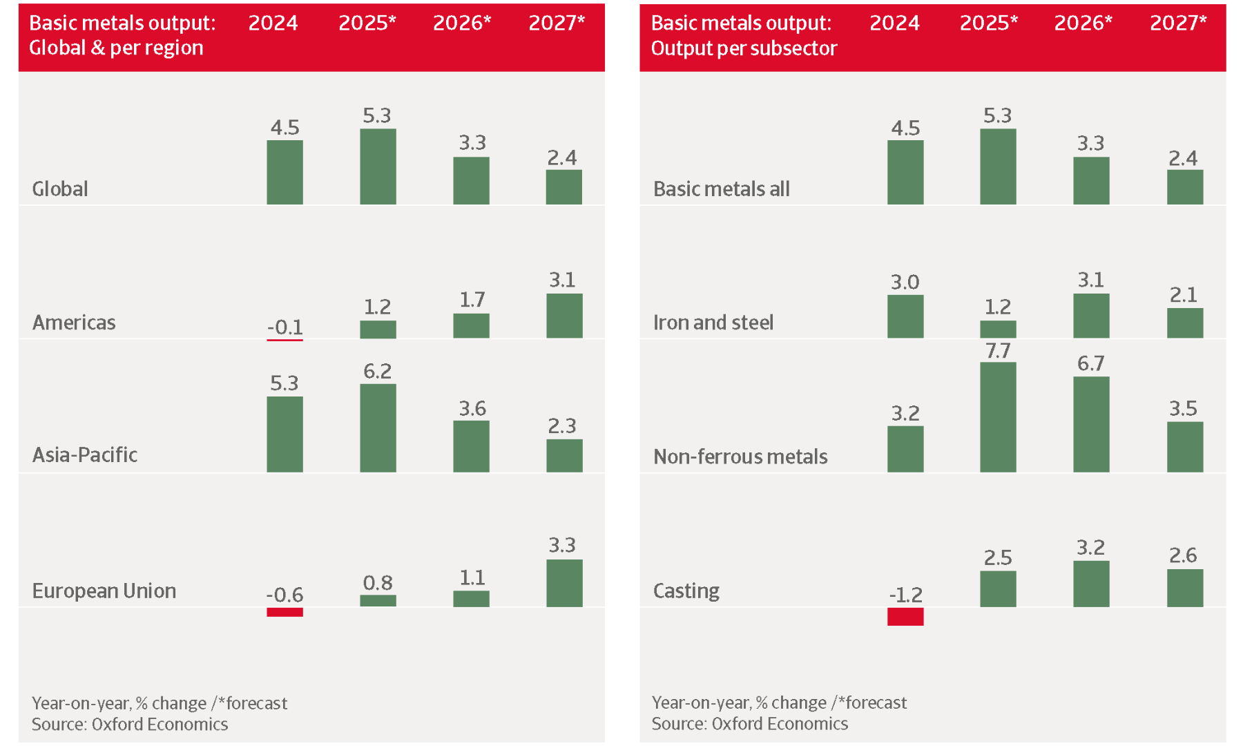 We expect a gradual recovery of metals performance in H2 of 2026 as past shocks fade and industrial demand rebounds. In 2027 EU basic metals output is forecast to increase by 3.3%.