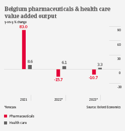 Belgium is one of Europe´s largest producers and a major export hub of pharmaceuticals. In 2019 (i.e. prior to the Covid-19 pandemic spread), the small country accounted for 13% of the EU´s pharmaceutical exports and 10% of pharmaceutical R&D investment. Belgium has become a major producer of Covid-19 vaccines, which led to a whopping 83% pharmaceuticals value added output increase in 2021, while pharmaceuticals exports accounted for 15% of total Belgian exports.