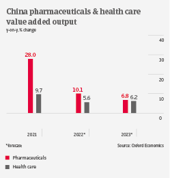 Strong growth is forecast for Chinese pharmaceuticals and health care value added output in 2022 and 2023. In the 2019-2025 period, annual growth of 9.4% is expected. With the Volume-based Procurement (VBP) policy and the National Reimbursement Drug List (NRDL), China has overhauled its health-care system. The main aim is to provide the population with broader access to quality drugs at lower prices. Global and domestic drug producers have to compete to sell their products in bulk to public hospitals. By winning a bulk purchase bid, drug producers have to accept substantial sales price cuts, which at first sight squeeze their profit margins. However, it also provides them with a major share of the Chinese market and high sales volume opportunities. Rising consumer wealth will increase demand for higher quality drugs, while the Chinese population will be rapidly ageing in the coming years.